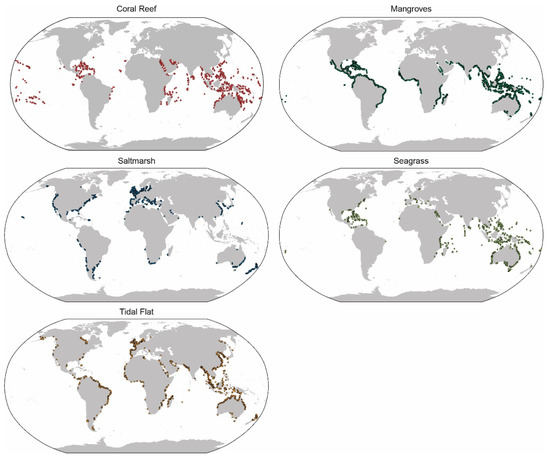 Mapping the distribution and change of the world’s coastal ecosystems is essential to monitoring their status, and to support policy and management interventions for their protection or sustainable utilization [1,2,3,4,5]. Yet, despite significant recent advances in cloud-based geospatial analysis platforms and improved access to Earth observation archives, global-scale monitoring of many coastal ecosystem types has remained unfeasible [4,5]. This is partly due to the considerable resources required to develop large, analysis-ready, reference datasets suitable for training and validating remote sensing classification models and algorithms for biophysical retrieval or classification [6,7]. Reference data are often developed through field work [7,8,9], image interpretation [7,10,11], or by sampling previously developed maps [12,13,14]. However, these approaches are highly labor-intensive and, in the case of sampling existing maps, can propagate uncertainties among otherwise independent mapping programs [11].