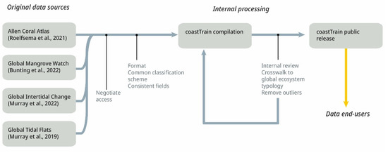 coastTrain is a standalone reference dataset developed to allow for rapid development, deployment and validation of global-scale maps of coastal ecosystem distributions (Figure 1). Primarily, coastTrain was developed to reduce the cost of setting up and running different formulations of satellite image-based coastal ecosystem classification models. In addition, coastTrain was made openly accessible with the aspiration to spark new efforts by research communities worldwide to improve the documentation of the distribution and change of the world’s coastal ecosystems. We brought together a project team consisting of project leaders of several of the world’s major coastal ecosystem mapping initiatives, forming an initial active collaboration to promote the open-sharing of reference data. With open data contributions by the Allen Coral Atlas [7,17,18,19], Global Mangrove Watch [12,13,20,21], Global Tidal Wetlands Change [11] and the Global Tidal Flats [10,22,23] research programs, we hope to support other ongoing and novel mapping and monitoring initiatives for coastal ecosystems while encouraging sharing of additional important coastal ecosystem reference datasets.