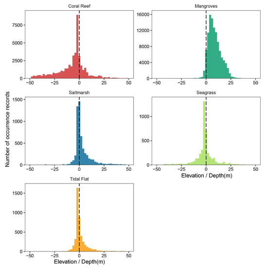 Elevation and depth summaries of each class in the coastTrain dataset. Each coastTrain data record was intersected with the ETOPO global relief dataset [41] to obtain their mapped elevation and depth with reference to sea level (0 m). Histograms for poorly represented coastal ecosystems (rocky shores and kelp forests) or for the ‘permanent water’ and ‘terrestrial other’ classes are not presented in this figure. Note that ETOPO integrates regional and global datasets into a global relief model developed at 1 arc-minute resolution.