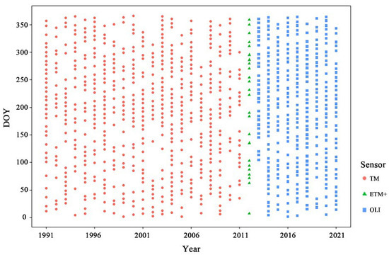 The collected Landsat imagery for Haitan Island by day of year (DOY) from 1991 to 2021.