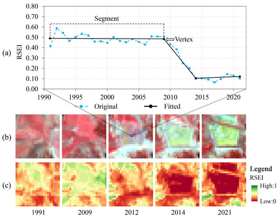 Example of LandTrendr’s segmentation and fitting of time series remote sensing-based ecological index (RSEI). (a) a line chart with the selected point, original RSEI values, and corresponding fitted values; (b) example of land cover type change at corresponding positions in Landsat images; (c) example of RSEI change in corresponding years.