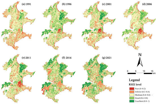 Example of five-leveled remote sensing-based ecological index (RSEI) images of Haitan Island. The different boundaries are due to reclamation. (a) RSEI in 1991; (b) RSEI in 1996; (c) RSEI in 2001; (d) RSEI in 2006; (e) RSEI in 2011; (f) RSEI in 2016; (g) RSEI in 2021.