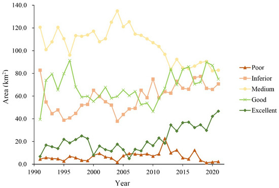 The areas of RSEI at different levels are shown in Figure 5. It can be seen that the medium level for RSEI had the largest area over 31 years, reaching an average of 105.19 km2, followed by the good level (67.83 km2) and inferior level (58.62 km2). The excellent and poor levels had the lowest area, reaching an average of 21.69 km2 and 6.74 km2. Notably, the RSEI for the poor level had the highest area in 2012 compared to the other years.
