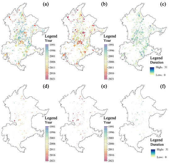 Spatial–temporal distribution of ecological quality (EQ) disturbance in Haitan Island from 1991 to 2021. Different colors represent different years. (a): start time of the first disturbance; (b): end time of the first disturbance; (c): duration of the first disturbance; (d): start time of the second disturbance; (e): end time of the second disturbance; (f): duration of the second disturbance.