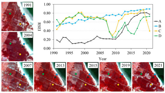 As seen in Figure 10, the implementation and progress of reclamation projects has occurred. It was found that the area of poor RSEI level increased from 8.96 km2 to 22.74 km2 between 2011 and 2012 because of land reclamation. Because of different policy orientations, afforestation was carried out in area A and a port and trade zone was developed in area B (Figure 10). The level of RSEI improved rapidly with the growth of afforestation in area A. While the RSEI in area B was maintained at a low level due to land construction, the RSEI gradually improved to an inferior and medium level until 2018. This can be explained by the gradually developing green infrastructure, which was reflected in an improved RSEI level.