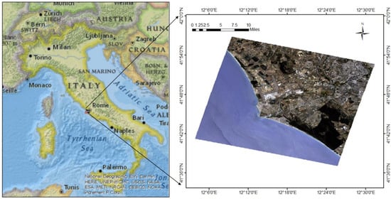 The hyperspectral PRISMA (PRecursore IperSpettrale della Missione Applicativa) data shown in Figure 1 comprises the estate of Castel Porziano in Rome and was acquired on 27 June 2021. This image was downloaded from the PRISMA archive on https://prisma.asi.it/ (accessed on 15 May 2022). Pine trees cover the majority of this estate. Additionally, this estate has different oak trees, cork trees, shrubs, and grasslands. This region has a humid climate and the temperature in this area varies from −5 °C in winter to 31 °C in summer. The region covered in this image has an elevation varying from 20 to 70 feet.