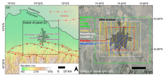 (a) Location of Bishkek in relation to adjacent active faults overlaid on hillshaded digital elevation model. Faults are from the Kyrgyz Institute of Seismology digitized by the Active Tectonics, Quantitative Structural Geology and Geomorphology Research Group [37]. Anticlines are from Styron [38]. (b) Analysis extents capturing Bishkek’s designated districts (gray shading) based on the spatial availability of each data source shown by colored polygons (colored lines for ICESat-2). The hashed blue polygon shows the intersecting WorldView-2 and Pleiades extents.