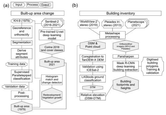Study methodology. (a) Built-up area classification and change detection. (b) Extraction of building footprints and heights using high-resolution satellite imagery.