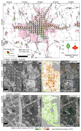 Redevelopment within Bishkek (1979–2021). (a) Digital number change 1979–2021 from the difference of KH-9 and Sentinel-2 imagery (Section 2.1.4). Pie charts show the proportional DN change aggregated to a 1 km2 grid for areas ≥50% built-up. Inset shows a violin and boxplot of Sentinel-2 NDVI values for negative DN change (vegetated) and positive DN change (built-up redevelopment) classes. (b) Example of redevelopment of an area in central Bishkek where the building layout noticeably changes. (c) Example increased vegetation (trees) around buildings in south Bishkek. Extents of (b,c) are shown on panel (a).
