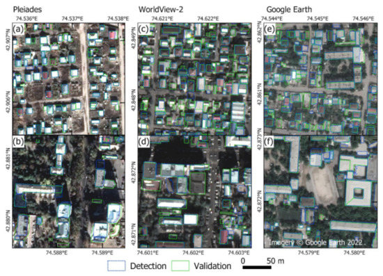 Within the respective data extents (Figure 1b), we extracted 205,056 buildings from the 2013 Pleiades imagery, 67,091 from the 2019 WorldView-2 imagery, and 429,001 from the 2021 Google Satellite Basemap imagery. OpenStreetMap buildings within the same AOI as the Google Satellite Basemap detections totaled 160,141. We extracted all building detections falling within the intersecting WorldView-2, Pleiades, and Google Satellite Basemap imagery extents (83 km2) (Figure 1b) to enable a comparison across all datasets through time. Buildings totaled 49,502 for the Pleiades imagery (2013), 61,102 for the WorldView-2 imagery (2019), 65,349 for the Google Satellite Basemap imagery (2021), 63,597 for GlobalMLBuildingFootprints (dated ~2016 for Bishkek, see Section 2.3.1), and 33,283 for OpenStreetMap (unknown date). The number of buildings within the intersecting AOI therefore increased by 11,600, as observed by the Pleiades (2013) and WorldView-2 (2019) datasets, and 15,847, as observed using the Pleiades and Google Satellite Basemap (2021). Within the larger Pleiades AOI (Figure 1b), there was a 42% (85,658) increase in buildings 2013–2021 observed from the 2013 Pleiades data (205,056 buildings) and 2021 Google Satellite Basemap (290,714 buildings). Buildings from the GlobalMLBuildingFootprints dataset within the Pleiades AOI totaled 275,462, which was therefore in the range of the Pleiades and Google Satellite Basemap-derived estimates.