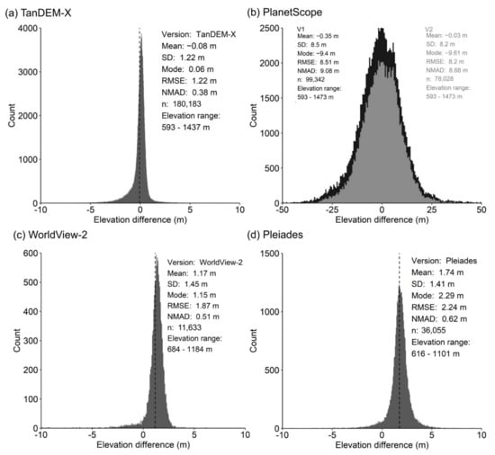 (a–d) Elevation accuracy statistics for DSMs compared to ICESat-2 data over their respective AOIs (Figure 1b).