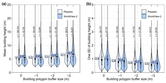 Mean and one standard deviation of elevation values were assigned to individual building polygons using internal polygon buffers of ranging from zero to three meters (Figure 8). The standard deviation of building height was observed to decrease with increasing buffer size. For example, standard deviation decreased from 0.9 m to 0.6 m in the Pleiades dataset for building polygons with no buffer and a buffer of −2 m, respectively (Figure 8b). The most stringent internal buffer (−3 m) did not lead to further improvement and notably reduced the number of buildings with valid heights assigned (following Section 2.3.2). We therefore used building heights extracted with a buffer of −2 m (Figure 8).