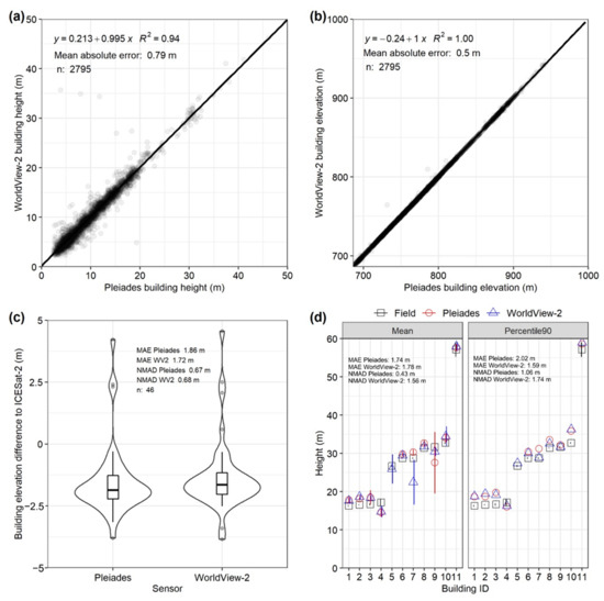 Comparison of Pleiades and WorldView-2 derived building heights (a) and absolute elevations (b) for buildings common to both datasets n = 2795. (c) Building height difference compared to ICESat-2 data. (d) Comparison of DSM-derived building heights and field measurements. Two methods of extracting the building height are shown using the mean (left) or 90th Percentile (right) of elevation values within the building polygon.