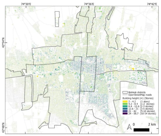 Independent Pleiades and WorldView-2 derived building heights (MAE = 0.79 m) and absolute elevations (DSM elevation values) (MAE = 0.50 m) (Figure 9a,b) showed close agreement. Similarly, comparing DSM-derived elevation values to ICESat-2 altimetry data revealed that the DSM elevation values were systematically lower than the ICESat-2 data by ~2 m (median values of −1.9 m and −1.6 m for Pleiades and WorldView-2, respectively) (Figure 9c). NMAD values from the DSM and ICESat-2 comparison were 0.67 m for Pleiades and 0.68 m for WorldView-2, whereas MAE values were closer to 2 m (Figure 9c). The building height MAE 1.74 m (Pleiades) and 1.78 m (WorldView-2) for buildings observed in the field were comparable to those obtained in the ICESat-2 comparison (1.86 m—Pleiades and 1.72 m—WorldView-2) (Figure 9c). The NMAD was lowest for the Pleiades-derived building heights for both the ICESat-2 (0.67 m) and field comparisons (0.43 m) (Figure 9c,d). We show the distribution of Pleiades-derived building heights, which covered most of Bishkek’s districts in Figure 10. The tallest buildings are clustered in the center of Bishkek and the southeast.