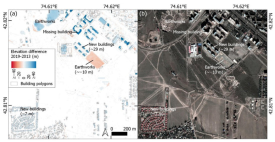 Disaster risk reduction strategies require an understanding of the exposure and vulnerability of people and assets to hazards [14]. For example, details of building structure including age, construction method and material, and height, are key information for modeling disaster risk in seismically active regions [4,15,16,17]. The automatic mapping of 2D urban growth using satellite data and image classification techniques is now widespread, e.g., [18,19]; however, retrieving the building-level 3D structure of a city generally requires expensive aerial imagery or light detection and ranging (LiDAR) surveys [20,21] or high-resolution digital elevation models (DEMs) [22]. Recently, approaches that can derive aggregated building height maps over 30–90 m grids have been developed, though they are best suited to buildings less than ~20–30 m tall [23,24]. Other approaches use shadow-based height estimation; however, this does not work well in densely urbanized areas with overlapping shadows [25,26]. Nonetheless, these approaches represent a valuable mechanism to drive the transition towards 4D city mapping, where timely updates could be envisaged.