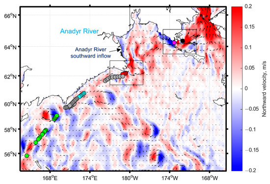 The experimental data analyzed in the present paper were collected during an expedition on the oceanic vessel “Professor Khljustin” in the western part of the Bering Sea in August 2013 (Figure 1). The circles in Figure 1 and Figure 2 indicate the locations of the simultaneous in situ and shipboard remote sensing measurements. In addition, an image of the averaged satellite estimates of chl-a concentration (from MODIS-Aqua measurements for August in the period 2002–2020 [19]) is shown in Figure 1, while the averaged northward velocity of the sea surface current (from CMEMS global ocean eddy-resolving reanalysis for August 2013 [20]) is illustrated in Figure 2. The classification of the obtained points and the corresponding color designations are presented in Section 4.2.