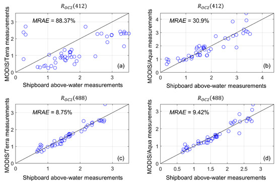 Quality analysis of the atmosphere correction of satellite data. Examples of the comparison of ship and satellite estimations of ROC2. Left column shows MODIS/Terra measurements (a,c), right column shows MODIS/Aqua measurements (b,d).