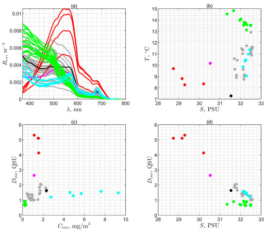 Figure 5a shows the obtained spectra of Rrs(λ) in the Bering Sea and scatterplots (Figure 5b–d) with different combinations of bio-optical and hydrophysical parameters.