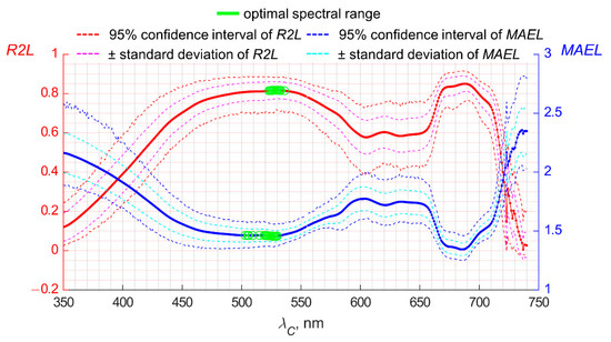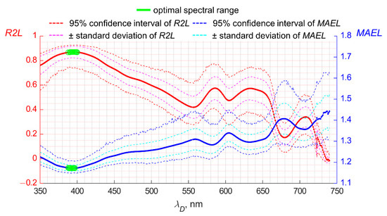 The green color marks the range with the lowest MAEL and statically insignificant changes in the best MAEL value, which was equal to 388–397 nm. A similar calculation for the spectral distribution of R2L gave a value for the optimal spectral range from 388 to 400 nm. Thus, the combined spectral range is equal to 388–397 nm.