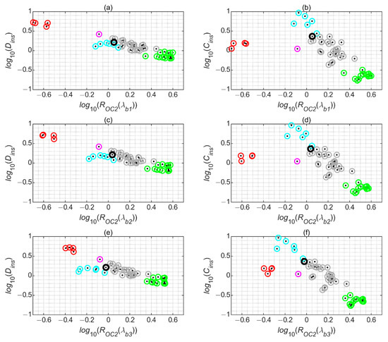 Scatterplots of the logarithms of in situ CDOM content (Dins) (a,c,e) or chl-a concentrations (Cins) (b,d,f) versus ROC2 band ratio index for the first three spectral ranges considered: b1 (a,b), b2 (c,d), and b3 (e,f). Band ratio values were obtained by applying OLCI/S3A spectral response functions to shipborne hyperspectral measurements collected using an ASD radiometer.