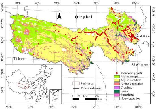 The Three-River Source Region (TRSR) (31°39′–36°16′N, 89°24′–102°23′E) is located in the hinterland of the Qinghai–Tibet Plateau in western China (Figure 1). It is also known as the Water Tower of China. The TRSR is the source area of the Yangtze, Yellow, and Lantsang rivers [37]. The average altitude of the study area is 4000 m, and it has a complex hydrological environment and rugged terrain characteristics. Alpine grassland (including alpine steppe and alpine meadow) is the main vegetation type, covering most of the study area.