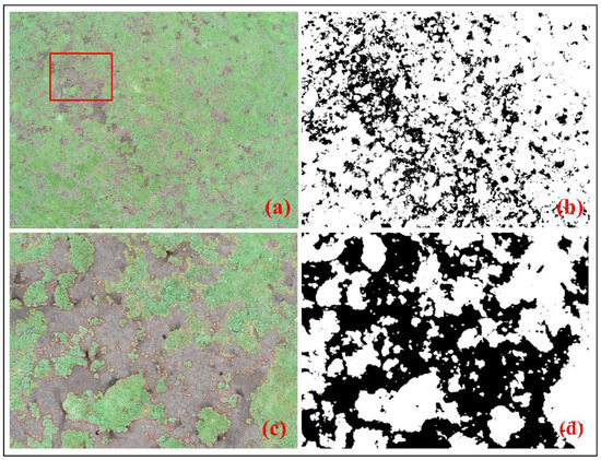 Aerial image and processing effect: (a) an aerial image acquired by the UAV; (b) the EGI segmentation results of the aerial image; (c) the red box of (a); (d) the EGI segmentation results of (c).