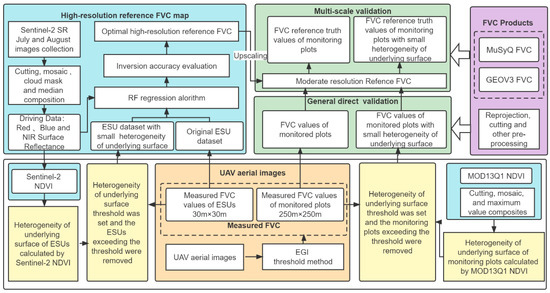 Work flow of this study. The blue box includes the information of remote sensing data, preprocessing methods, and further processing results. The orange box contains the FVC measured data and preprocessing methods. The yellow box is the USH test method. The purple box shows the FVC product data to be validated and the FVC product preprocessing method. The green box contains various datasets via diverse validation methods to validate the accuracy of the two FVC products.