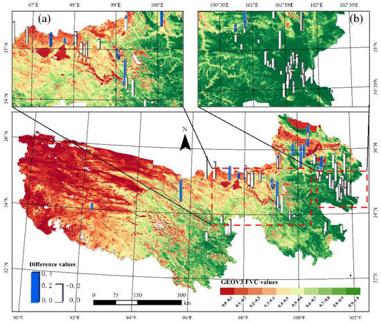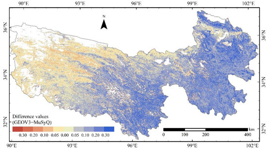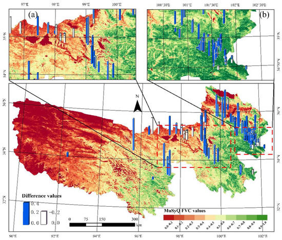 The pixel values of GEOV3 and MuSyQ FVC products are significantly different in TRSR (Table 1). Compared with the MuSyQ FVC product, the GEOV3 FVC product had more pixels with FVC values of greater than 0.8 and less than 0.1. Nonetheless, the MuSyQ FVC product had more pixels with FVC values between 0.1 and 0.7. The spatial distribution pattern of the differences between the GEOV3 and MuSyQ FVC products (Figure 6) revealed that the FVC values of the GEOV3 FVC product in the southern and eastern parts of the TRSR were significantly larger than those of the MuSyQ FVC product. The negative differences and positive differences between the two FVC products in the western part of TRSR were widely distributed, and the FVC values of the GEOV3 FVC product were less than or slightly more extensive than those of the MuSyQ FVC product in this region.
