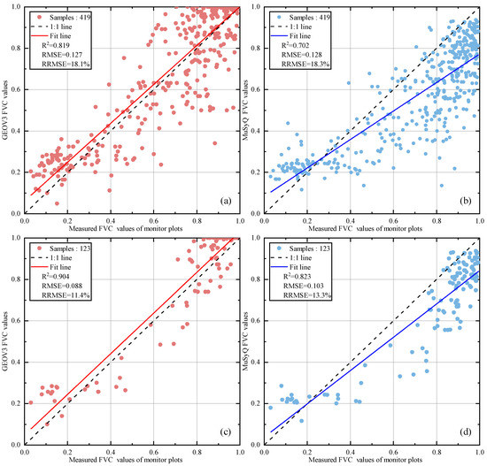 The direct validation results based on the measured values of the remote sensing monitoring plots showed that the GEOV3 FVC and MuSyQ FVC products had good accuracies (Figure 7a,b). However, the accuracy of the GEOV3 FVC product (R2 = 0.819, RMSE (RRMSE) = 0.127 (18.1%)) was better than that of the MuSyQ FVC product (R2 = 0.702, RMSE (RRMSE) = 0.128 (18.3%)). For the GEOV3 FVC product, the scattered points composed of the measured values of the remote sensing monitoring plots and the pixel values of the corresponding product were evenly distributed around the 1:1 contour line, but they were relatively scattered, and some of the points deviated significantly from the 1:1 contour line. For the MuSyQ FVC product, the scatter of the points composed of measured values and pixel values of the corresponding product deviated greatly from the 1:1 contour line. When FVC > 0.3, most of the scattered points were located below the 1:1 contour line, exhibiting an evident underestimation phenomenon.