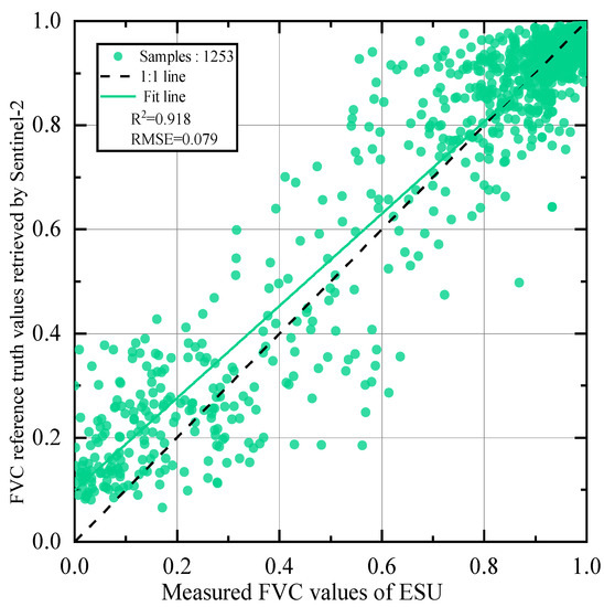 The multi-scale validation method based on high-resolution data first establishes the relationship between the ground elementary sampling units (ESU) and high-resolution satellite image pixels using empirical or semi-empirical models, physical models, or machine learning models [23]. Then, the inversion of the required parameters is completed, and upscaling is conducted (usually via pixel aggregation) to maintain the spatial resolution consistent with the spatial resolution of the coarse resolution FVC product [24]. Finally, the pixel values of the two images are compared to evaluate the accuracy of the remote sensing product. This validation method is often applied in product validation activities in specific regions. For example, Mu et al. and Jia et al. improved the spatial scale of the ground ESU with the help of high-resolution remote sensing images in the Heihe River Basin, China, and they validated the accuracy of the GEOV1 and GLASS FVC products, respectively, in the Heihe farmland area. Their results showed that the GEOV1 can produce a systematic overestimation of the FVC of up to 0.2 in farmland, while the RMSE of the GLASS FVC in farmland is only 0.087, indicating a relatively high accuracy [25,26].