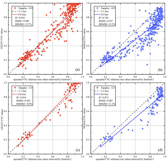 Comparison of FVC reference truth value in monitored plots with the FVC product pixel value (GEOV3 (a), MuSyQ (b)); and comparison of FVC reference truth value in monitored plots with small HUS with the FVC product pixel value (GEOV3 (c), MuSyQ (d)).