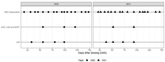 Seasonal calendar of UAV observations and crop measurements (LAI, LCC, LMA, and EWT) during the two years (2020 and 2021).