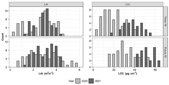 The distribution of the leaf area index (LAI) and leaf chlorophyll content (LCC) measured during two years on green and yellow hemp cultivars is shown in Figure 3. Generally, “Futura 75” showed higher LAI and LCC values than “Fibror 79”. Regarding the LAI, “Fibror 79” and “Futura 75” showed the lowest (LAI < 1 m2 m−2) and the highest values (LAI > 5 m2 m−2) in 2020 while they showed a high frequency of the data in intermediate values (1.5 m2 m−2 < LAI < 4.5 m2 m−2) in 2021. Regarding the LCC, “Fibror 79” and “Futura 75” showed the lowest values (LCC < 18 µg cm−2 for “Fibror 79” and LCC < 40 µg cm−2 for “Futura 75”) in 2020 compared to the LCC values recorded in 2021.