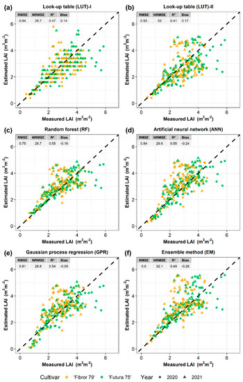 Estimated vs. measured LAI of hemp with different inversion methods: (a) LUT-I, (b) LUT-II, (c) RF, (d) ANN, (e) GPR, and (f) EM.