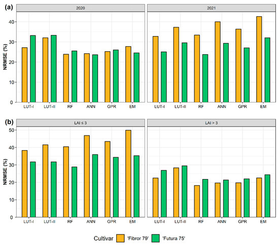 NRMSE values of the inversion methods for LAI estimation according to the different cultivars and (a) years and to the different cultivars and (b) two LAI intervals (LAI ≤ 3 m2 m−2 and LAI > 3 m2 m−2).