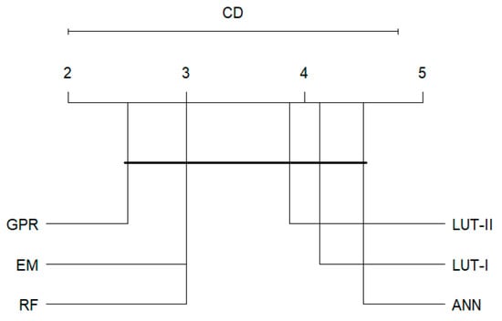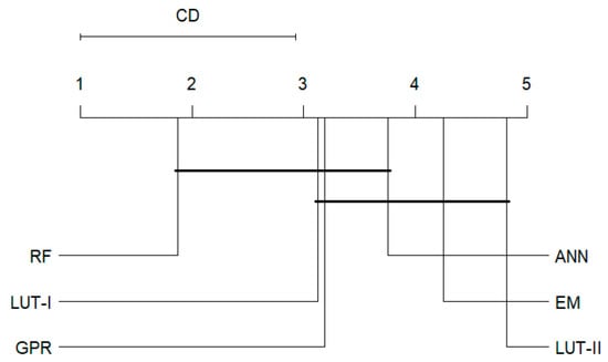 Critical distance diagram of the inversion methods performance for LAI estimation. The groups of the inversion methods that are not significantly different are connected with black line (p-value > 0.05).