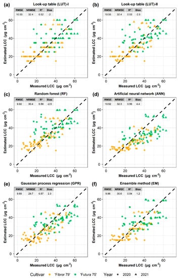 Estimated vs. measured LCC of hemp with different inversion methods: (a) LUT-I, (b) LUT-II, (c) RF, (d) ANN, (e) GPR, and (f) EM.
