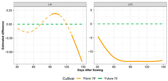 The generalised additive model (GAM) was applied to the time series of LAI and LCC estimated by the inversion of the PROSAIL model, with “Futura 75” as a reference for estimating significant differences among the hemp cultivars during the growing season (Figure 11). The estimated differences of LAI between “Futura 75” and “Fibror 79” were significant from 91 DAS to 108 DAS, with higher values of LAI for “Fibror 79” than for “Futura 75”, while higher values of LAI for “Futura 75” than for “Fibror 79” were observed from 129 DAS until the end of the growing season (Figure 11). Higher values of LAI were observed in “Futura 75” than “Fibror 79” during the early phases of the growing season (until 72 DAS), but no significant differences were observed. The estimated differences of LCC were significant throughout the whole growing season, with higher values of LCC for “Futura 75” than for “Fibror 79” (Figure 11). The estimated differences of LCC showed an increase from the start of the growing season up to 75 DAS (estimated difference of −13.5 µg cm−2) and remained constant afterward until the end of the growing season.