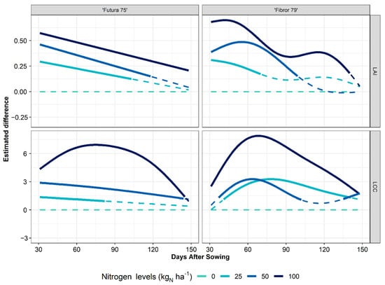 Dynamics of the estimated difference of LAI and LCC across nitrogen fertilisation levels for hemp cultivars. The reference nitrogen fertilisation level with 0 kgN ha−1 is represented with a light green dashed line. The estimation of the differences between nitrogen fertilisation levels along the time series was carried out using a GAM. Solid and dashed coloured lines denote, respectively, significant (p-value < 0.05) and not significant differences of the corresponding nitrogen fertilisation levels compared to the reference nitrogen fertilisation level (0 kgN ha−1). A positive difference between the reference and any other level of nitrogen fertilisation means that the reference has a lower value of LAI and LCC.