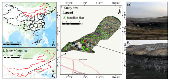The research site is adjacent to an open-pit mine located in the Ordos Plateau, Inner Mongolian, China (Figure 2). The topography is generally flat in the east and high in the west, with an altitude range of 850 m to 2149 m. The typical annual precipitation and temperature range from 170 mm to 450 mm and 5.3 °C to 8.7 °C, respectively. The coal resources of the Ordos Plateau are rich [39]. Moreover, the coal industry is very important for the economic growth of the Ordos. Nevertheless, mining activities generate obvious passive influences on the natural environment. Recently, heavy metal pollution around the coal mine, especially in the nearby cropland, has aroused wide concerns.