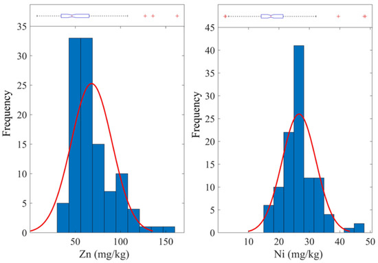 Histograms and box plots of Zn and Ni concentrations (No. of samples = 110). (Note: The red curve is the fitting line; “+” denotes outliers.)