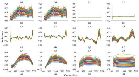 Original and pretreated soil reflectance curves. (Notes: (a) OR is the original soil reflectance curve; (b) SG denotes the soil reflectance curve smoothed by SG; (c–l) L1–L10 are the reconstructed spectra using CWT at decomposition scales of 1–10).