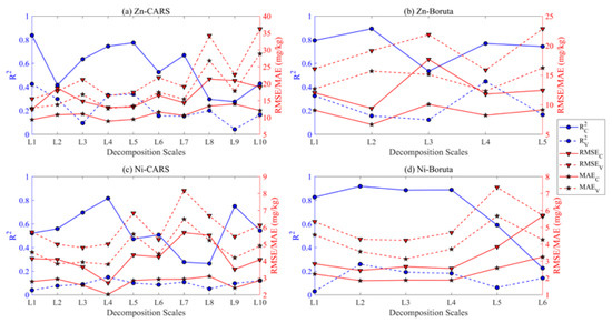 For the Ni element, the best RF prediction model with the highest R2 (0.2615), lowest RMSE (4.0933 mg/kg), and MAE (3.4126 mg/kg) was determined by the Boruta feature selection at the L2 scale of the CWT (Figure 7d).