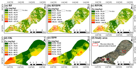 To compare the reliability of heavy metal concentrations distribution maps, five maps generated by RF, RFIDW, RFOK, OK, and IDW, are shown simultaneously (Figure 9 and Figure 10). Figure 9f and Figure 10f are true-color GF-5 images of the study area.