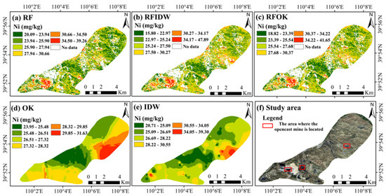 Hence, the RFOK was selected as the final method to map the heavy metal concentrations in this study (Figure 9c and Figure 10c).