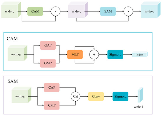 The structure of CBAM. ‘CAM’ and ‘SAM’ denote the channel and spatial attention modules, respectively. Similar to ’GAP’, ‘GMP’ is the max-pooling operation along the spatial dimension. Similarly, ‘CAP’ and ‘CMP’ are the operations along the channel axis, respectively. The results of ‘GAP’ and ‘GMP’ use the identical ‘MLP’, which is composed of sequential fully connected layers.