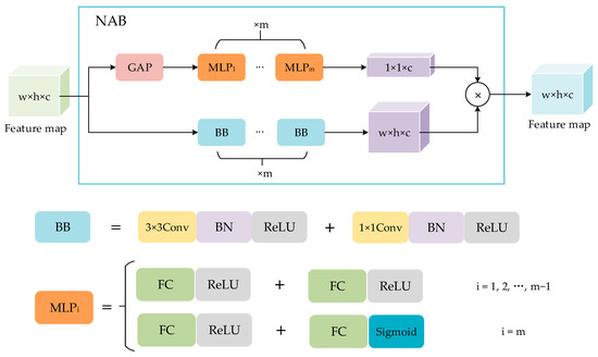 The structure of NAB. ‘BB’ is the abbreviation of bottleneck block. The number of ‘MLP’ and ‘BB’ denoted by m is equal. The second ‘FC’ in the last MLP uses a Sigmoid activation function to scale the factors into the range of 0–1.