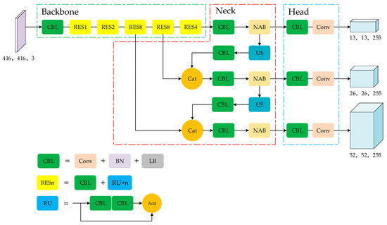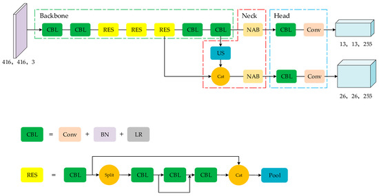 The network of the improved YOLOv3. It can be divided into the backbone, called Darknet53; the neck, which contains FPN and NAB; and the head, which is composed of two convolutional layers. ‘Cat’ and ‘US’ denote the operations of concat and up-sampling, respectively. ‘LR’ is the abbreviation of Leaky ReLU.