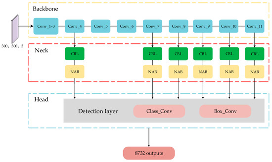 SSD is another paradigm of one-stage detectors. The backbone is composed of the truncated VGG16 and several auxiliary convolutional layers. It selects six multi-scale feature maps that are generated by different convolutional blocks of the backbone. Then, these feature maps are transmitted to the corresponding detection layers in the head. Each layer has two convolutional layers, one for predicting the probabilities of classes and the other for predicting the information of bounding boxes. If the input size is 300 × 300, then SSD will generate 8732 outputs. Because of the large size of optical remote sensing images, the application of SSD in remote sensing has extremely tremendous computation complexity and low detection efficiency. As a result, we improved SSD for validating the generality of NAB in nature images rather than remote sensing images. In the original SSD, the author introduced ‘L2_norm’ to scale the feature map of ‘Conv_4′, which is different from others. Because NAB also has the same function, we concisely removed the ‘L2_norm’. We inserted NAB and ‘CBL’ between the backbone and the head of SSD to enhance the capability of feature representation and facilitate the feature transition, as depicted in Figure 5. Section 4.3 shows the excellent generalizability of NAB in detecting nature images.