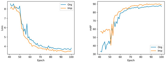 The loss and mAP curves of YOLOv3 and YOLOv3-NAB (m = 1). ‘Org’ and ‘Imp’ denote YOLOv3 and YOLOv3-NAB (m = 1), respectively.